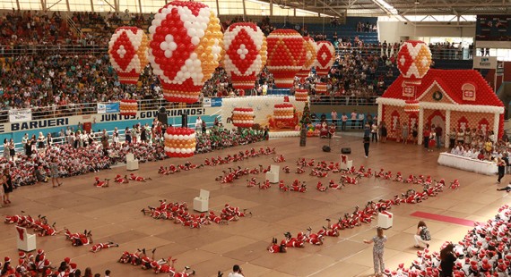 O ginásio José Corrêa foi o “mundo encantado do Natal” neste final de semana, nas três belas festas que a Secretaria de Educação de Barueri promoveu para a formatura das pré-escolas mantidas pela Prefeitura. Pais, convidados e autoridades conferiram um verdadeiro show de cores, música, dança, emoção e alegria nas três cerimônias de sábado e domingo, que lotaram o ginásio, na região central da cidade. As crianças entravam no clima do mundo do Natal por um portão feito de bexigas, como que entrando no “quintal do Papai Noel”. Bexigas formavam balões no “céu” do ginásio, que encantaram não só as crianças como os adultos. Para marcar mais ainda o ambiente de fantasia no José Corrêa, Papai Noel e a assistente tiraram várias fotos com as crianças. Cerca de 4.600 crianças das 25 pré-escolas receberam seus certificados de conclusão desta fase educacional de suas vidas. Entre as autoridades, a festa contou com a presença de vereadores, do prefeito Gil Arantes, da presidente do Fundo Social de Solidariedade Silvia Arantes, e do vice-prefeito e secretário de Educação Jaques Artur Munhoz. | |