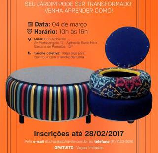 Pensando na transformação urbana a partir da sustentabilidade, a Fundação Alphaville, em parceria com a Secretaria Municipal de Planejamento Urbano e Meio Ambiente de Santana de Parnaíba e a Redeco realizam, no dia 04 de março, um minicurso gratuito sobre mobiliários para jardim. A ideia é aproveitar os pneus usados para transformar o jardim em um espaço mais colorido e funcional.