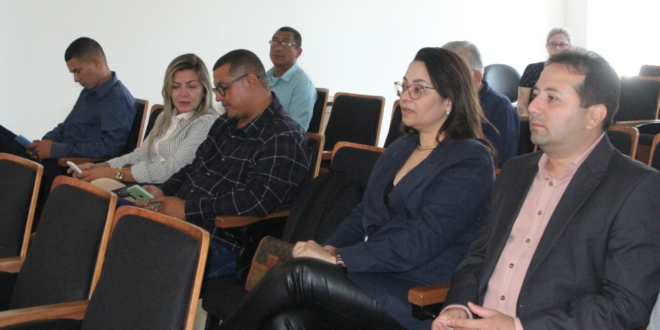 O presidente do Ipresb, Weber Seragini, acompanhado dos gestores de investimentos Eliezer Antonio da Silva; de finanças, Douglas Oscar de Jesus; de benefícios previdenciários, Marcelo Rodrigues Laranjeira; e de administração interino, Rafael Freire Silva, apresentou o Instituto e detalhou as áreas e as ações que realizam.
