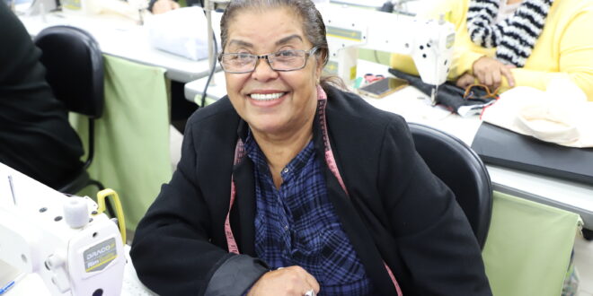 142 alunas aprendem no Núcleo de Moda Central, no prédio da Sads. Francisca de Paula Vieira tem 67 anos e sai do Jardim Mutinga para aprender e realizar um sonho de quando era adolescente. “Com 13 ou 14 anos eu era arrematadeira na região da José Paulino. Namorei, casei, construí uma família e tempos depois era aquela vida vazia, sem sentido”.