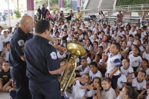 Chegar ao pátio da escola e encontrar um grupo de guardas municipais no palco é mesmo de chamar a atenção. E não foi diferente com os alunos da Emef Egídio Costa (Jardim Califórnia). A escola recebeu a banda da Guarda Municipal de Barueri com o projeto Musicalizando, na terça-feira (dia 24).