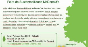 1ª Feira Sustentável acontece no próximo sábado (7/4) no estacionamento do restaurante Barueri Drive e é aberta para o público O McDonald’s realizará em Barueri a 1° Feira da Sustentabilidade nesse sábado (7/4), no estacionamento do restaurante McDonald’s Barueri Drive, que fica localizado na Rua Henriqueta Mendes Guerra, 486. O …